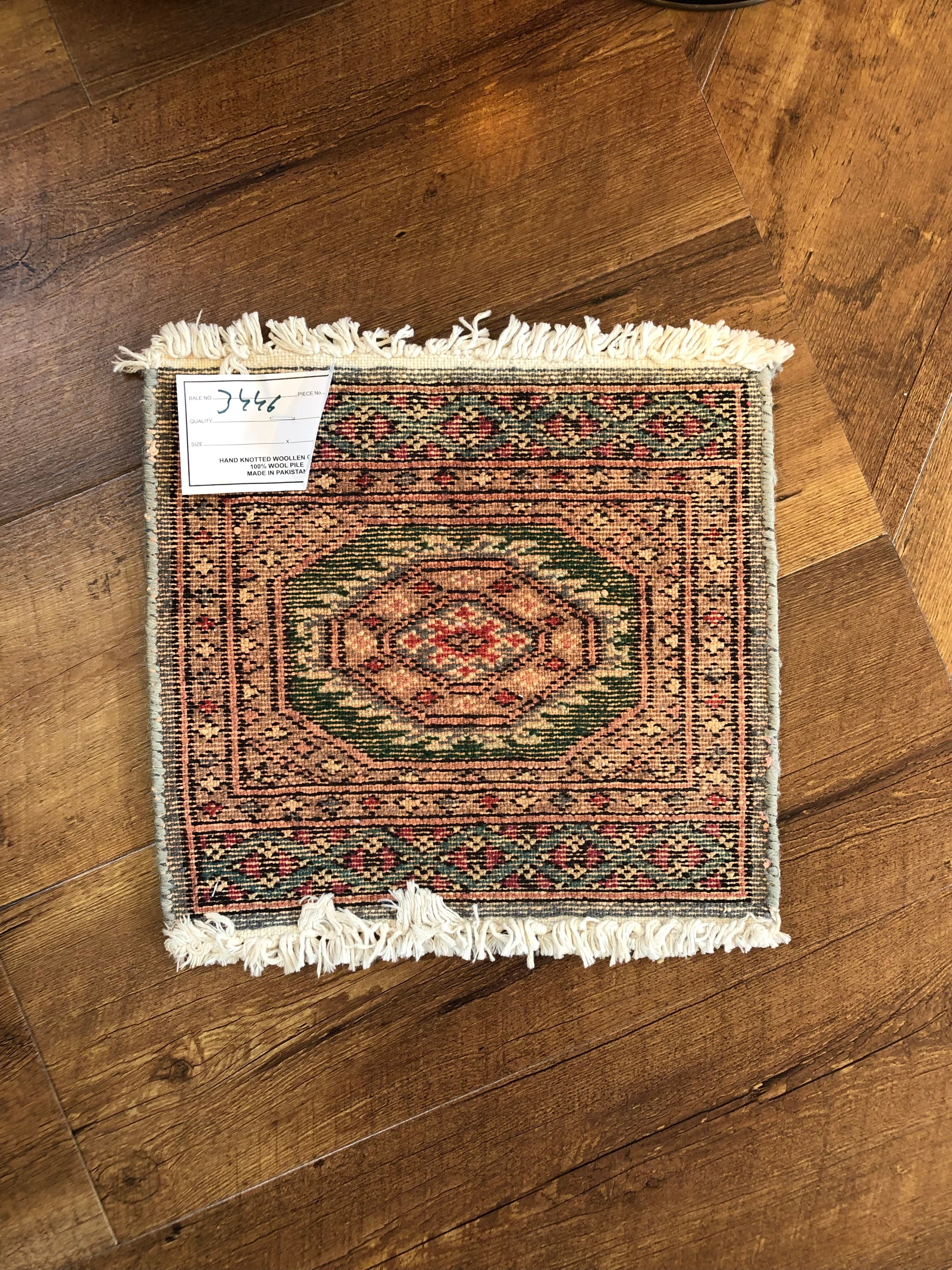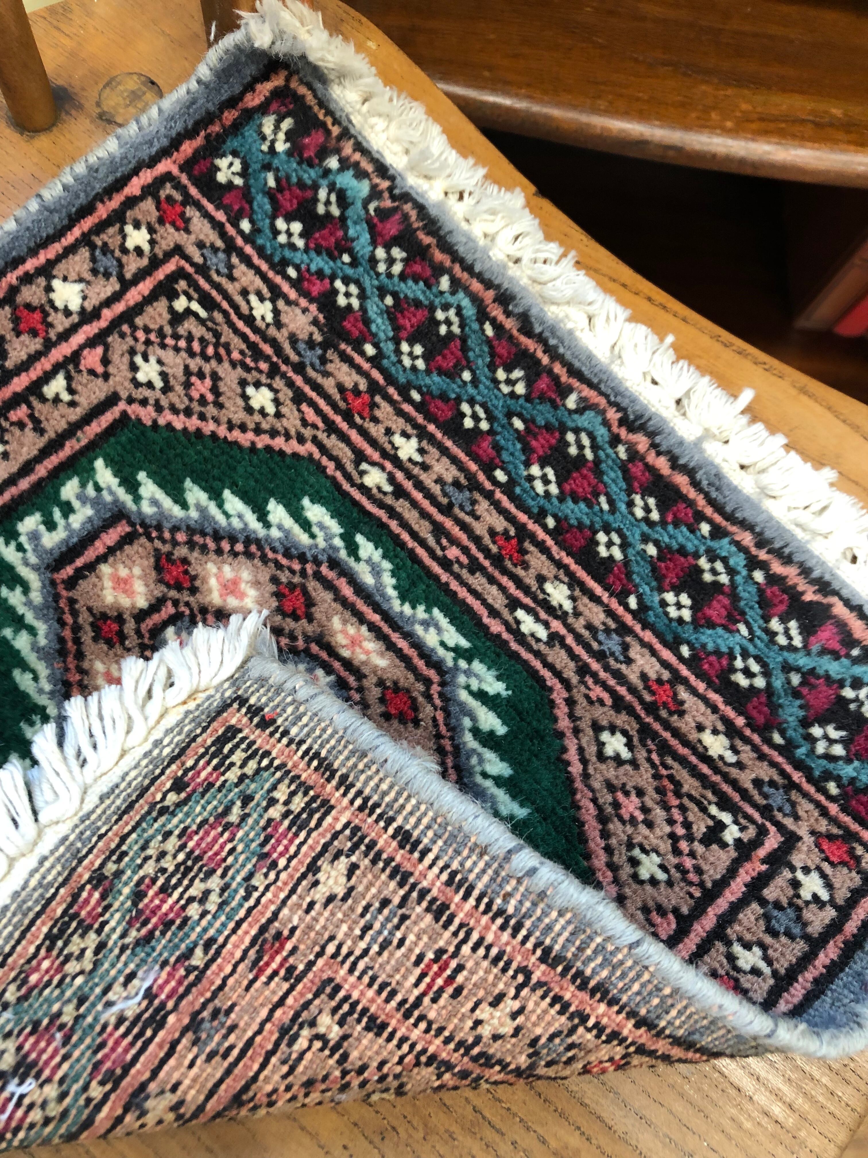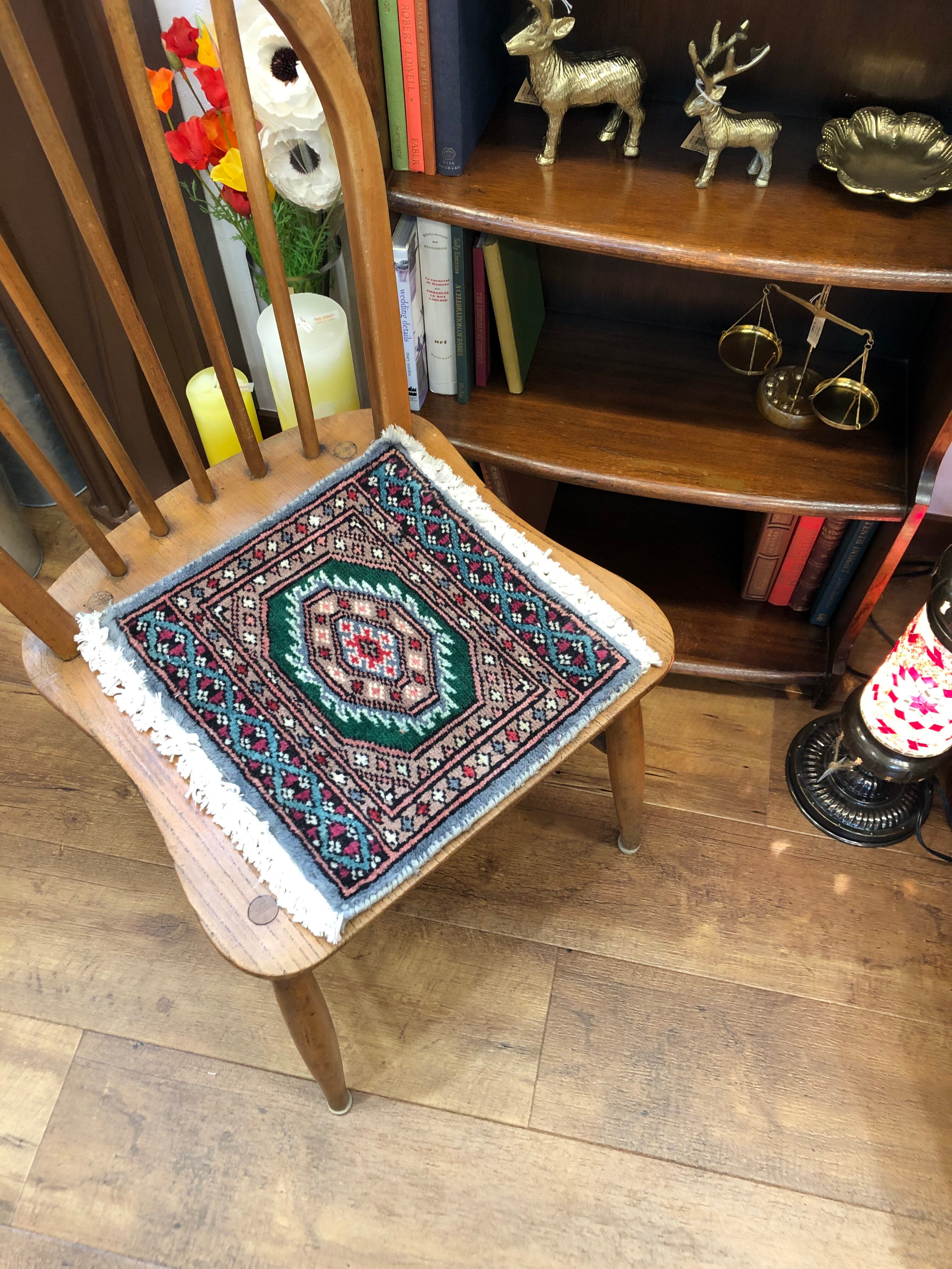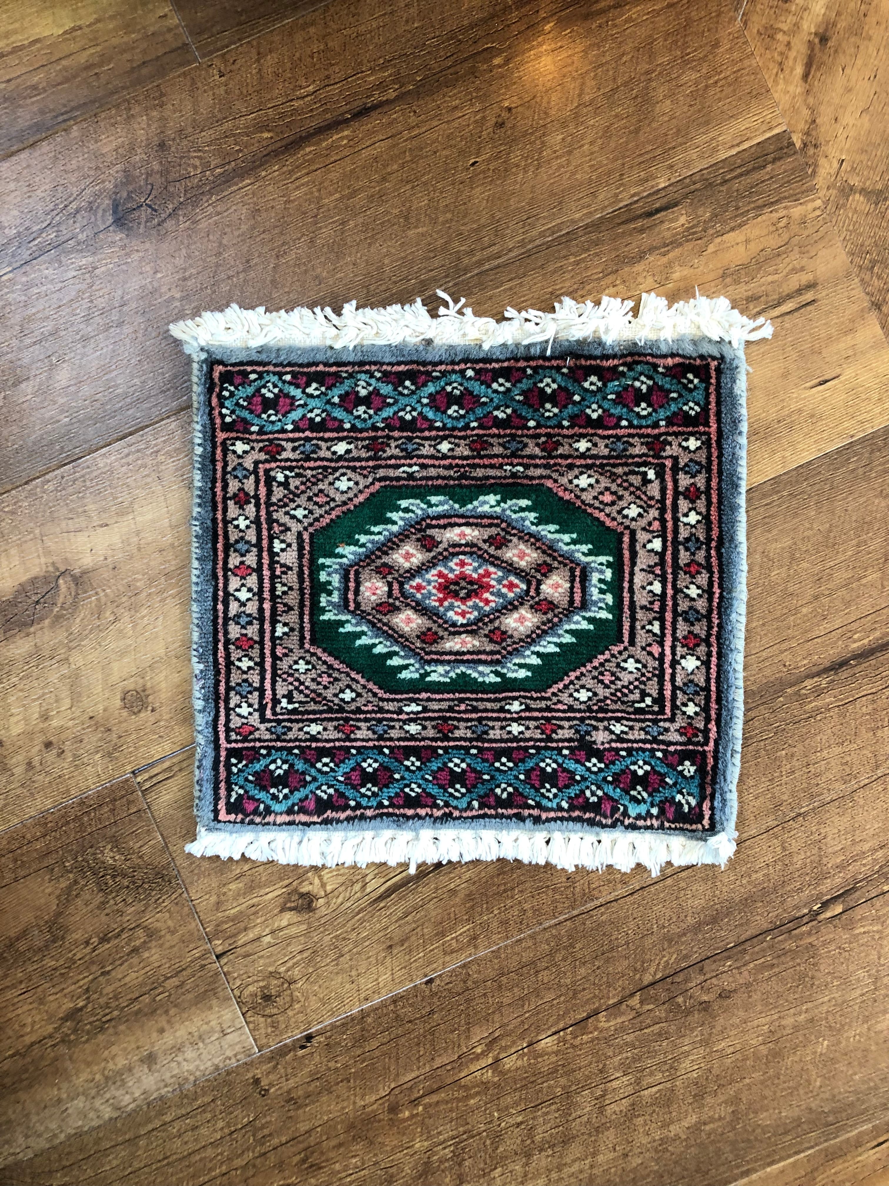 グレーがかった青に緑が際立ったあまり見かけない色味のミニラグです!