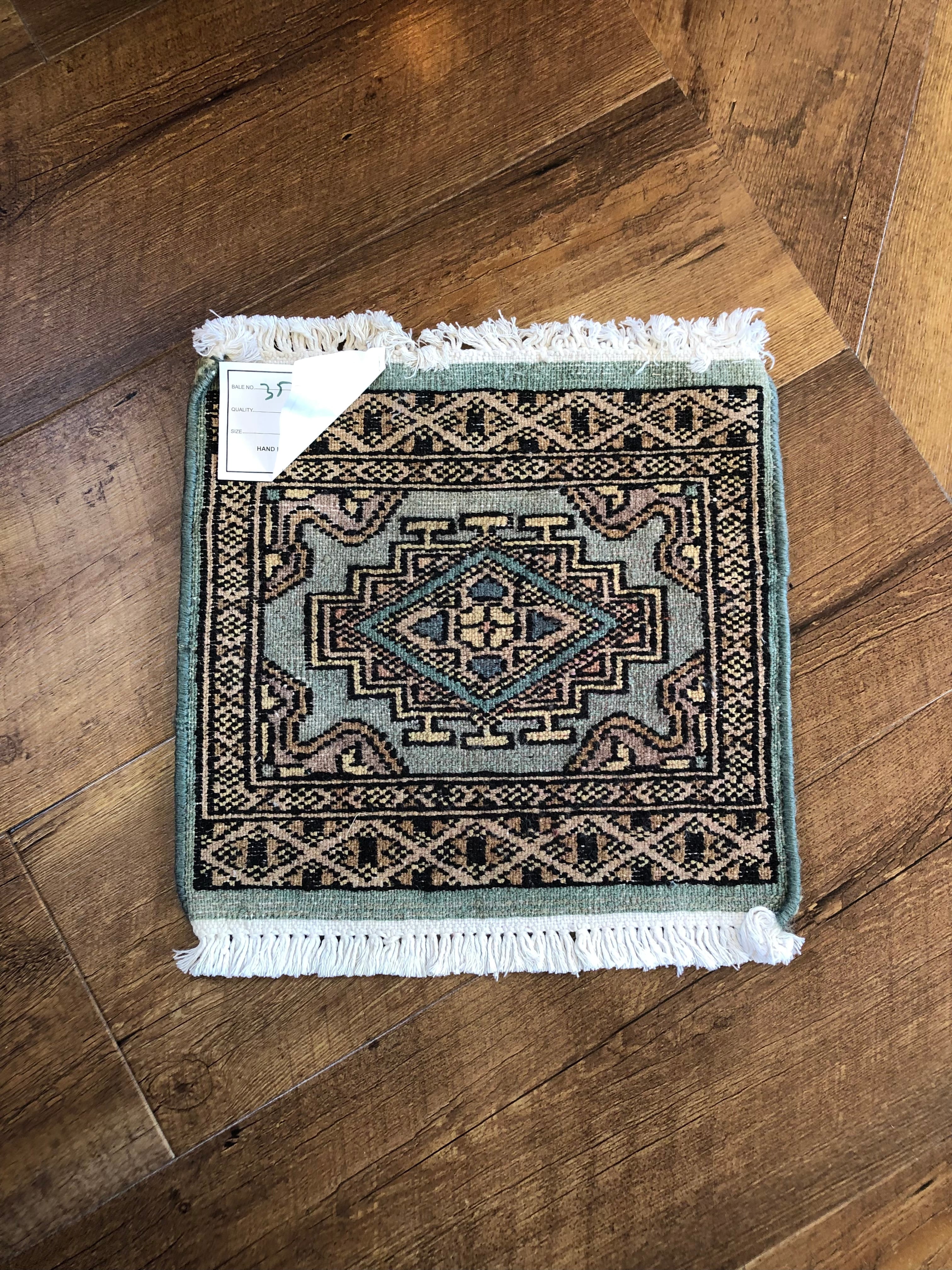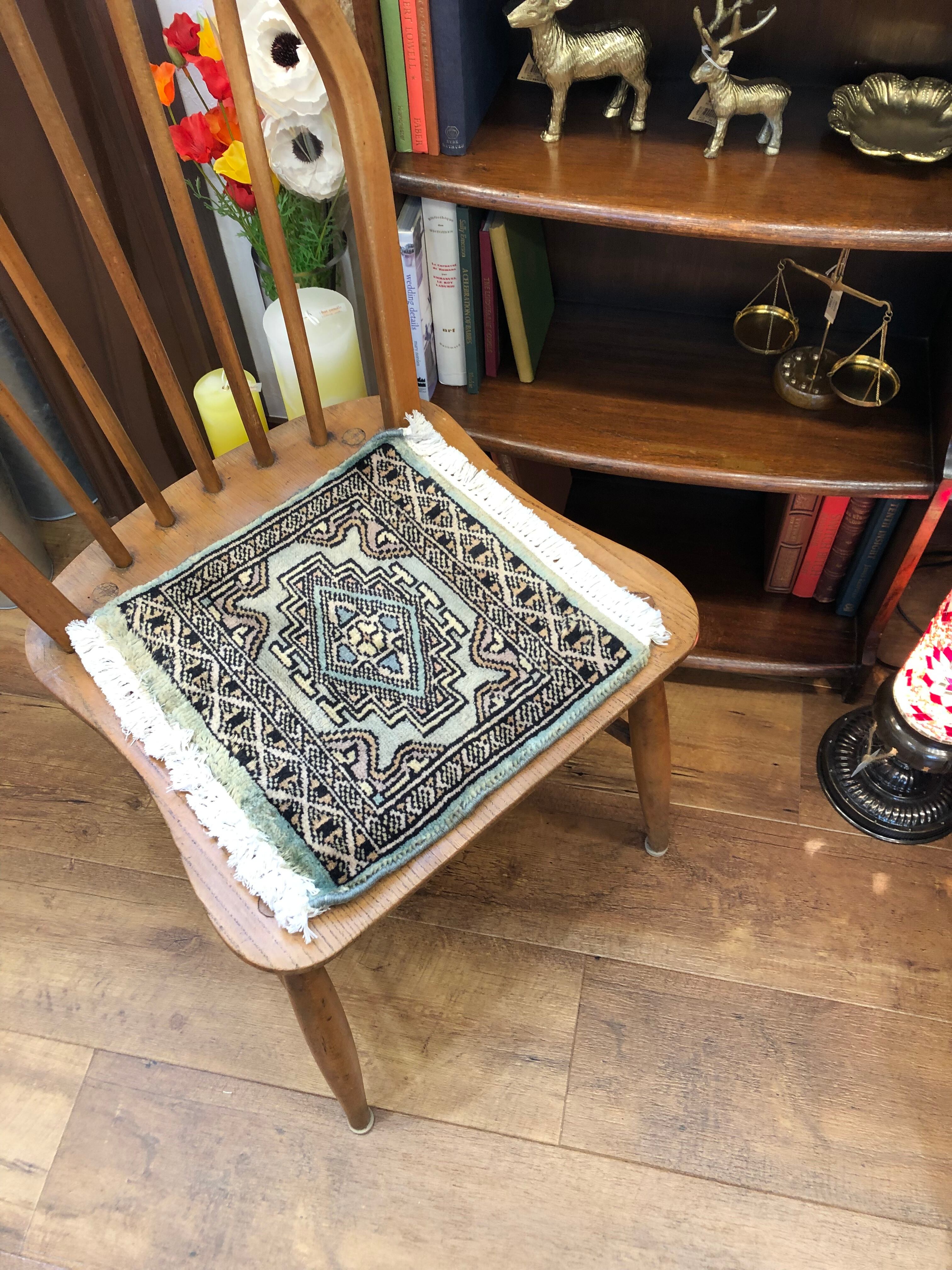 グレーと黄色と青を混ぜたような色味のミニラグは、自然の毛の風合いがとてもいきています。