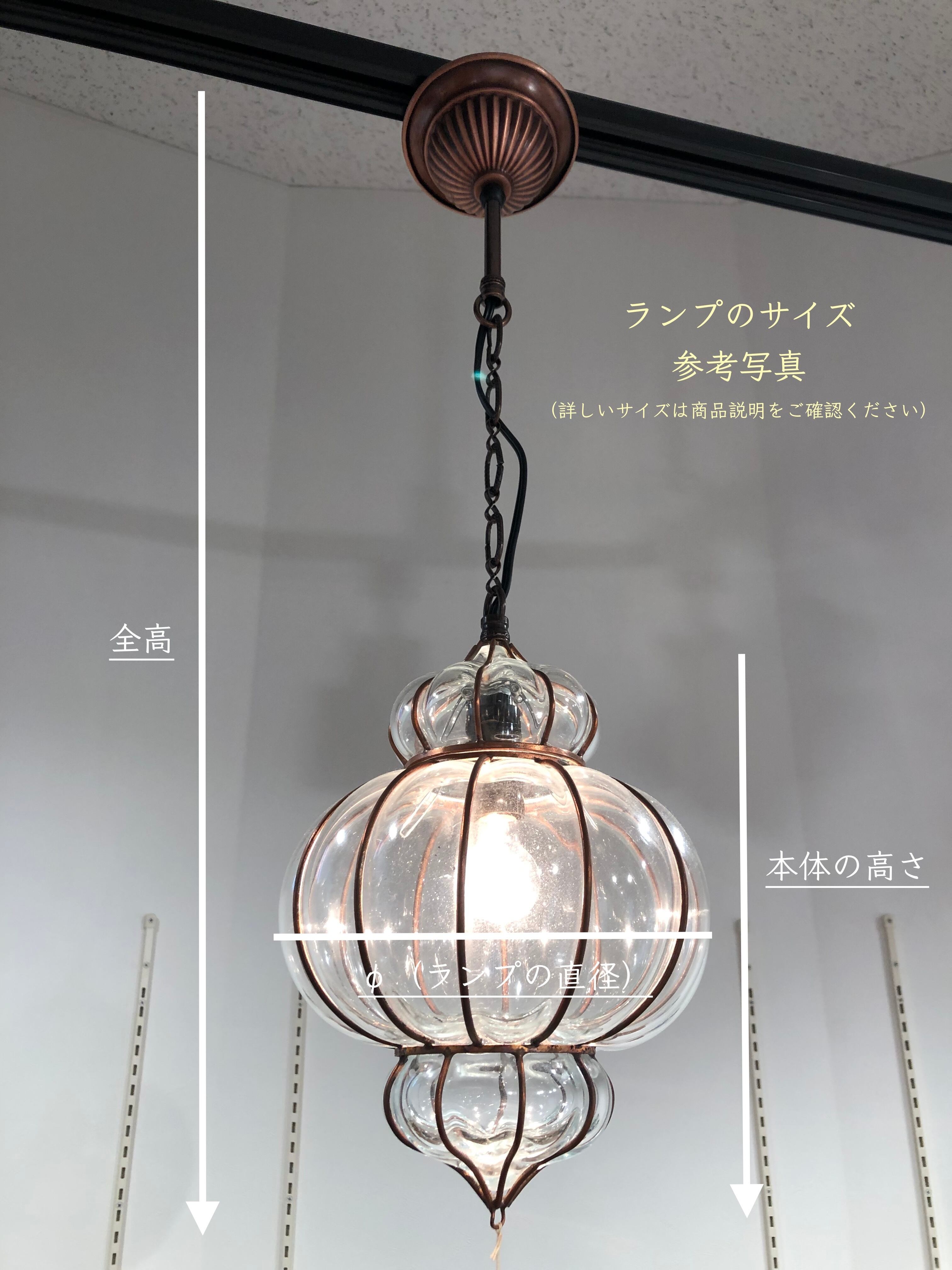 ※こちらのランプは3本のチェーンでランプ本体をつっています。ガラスランプ本体上部はバネで留まっていますので、本体上部を持って引っ張ると外れますのでご注意ください。