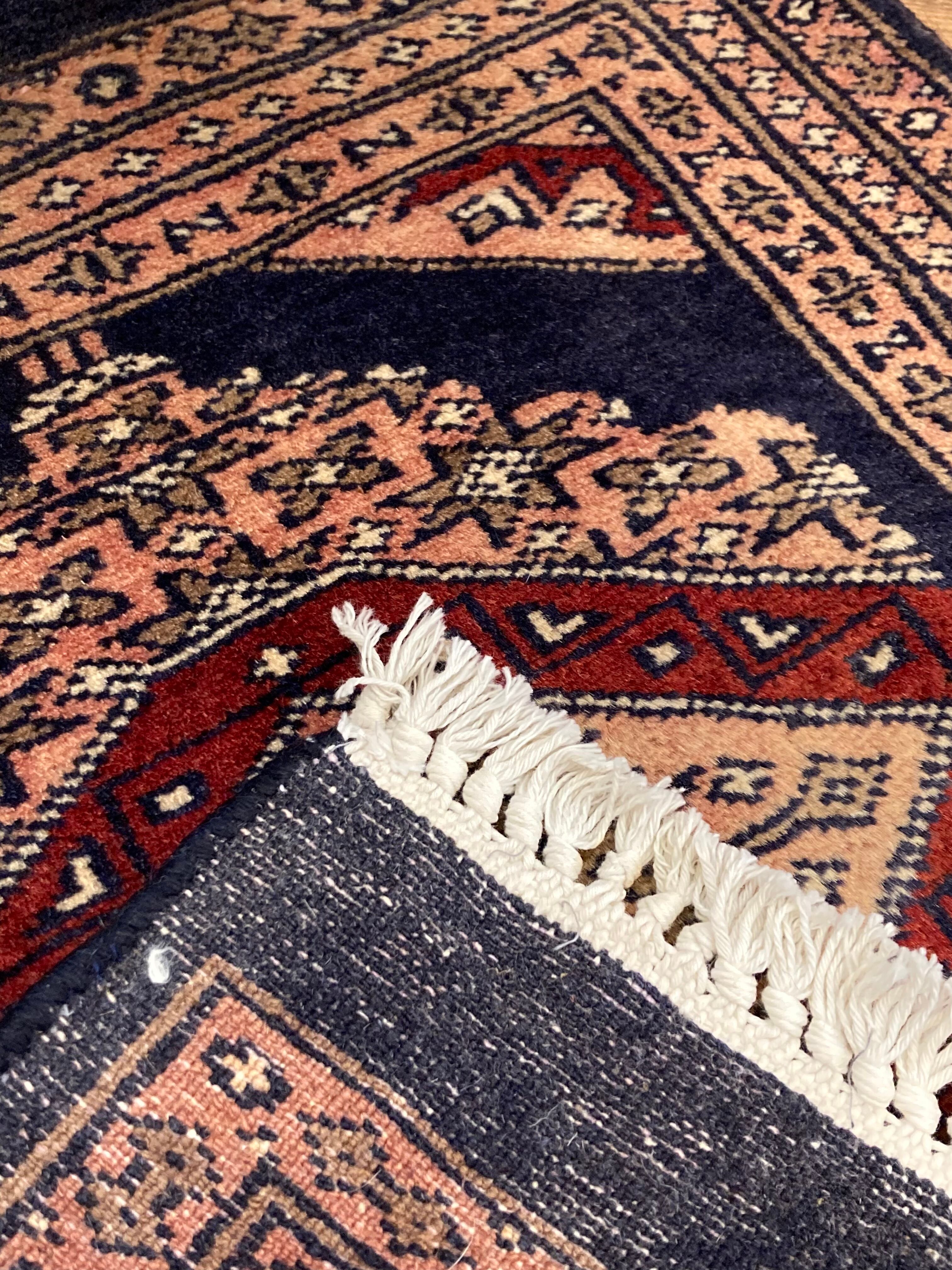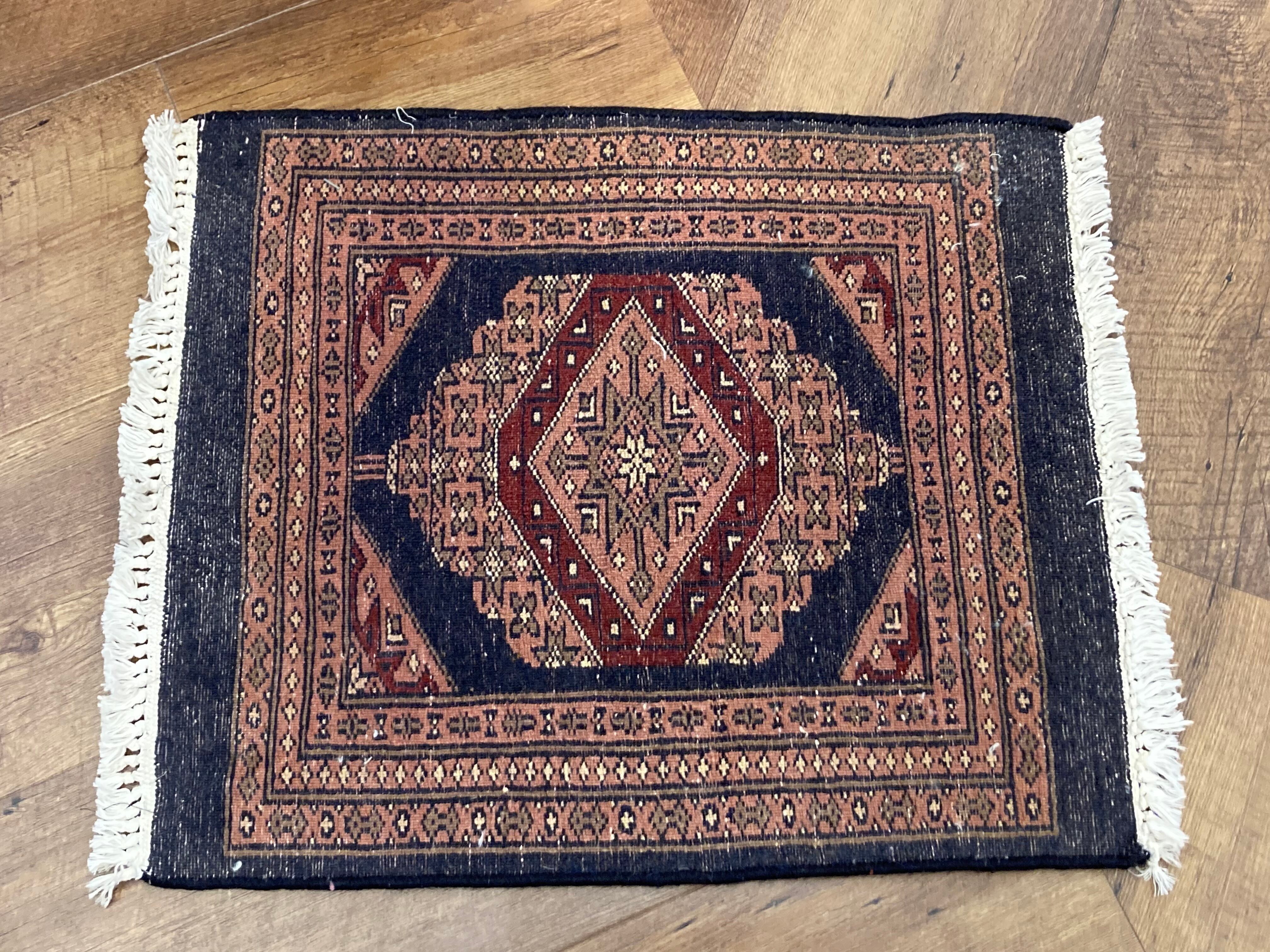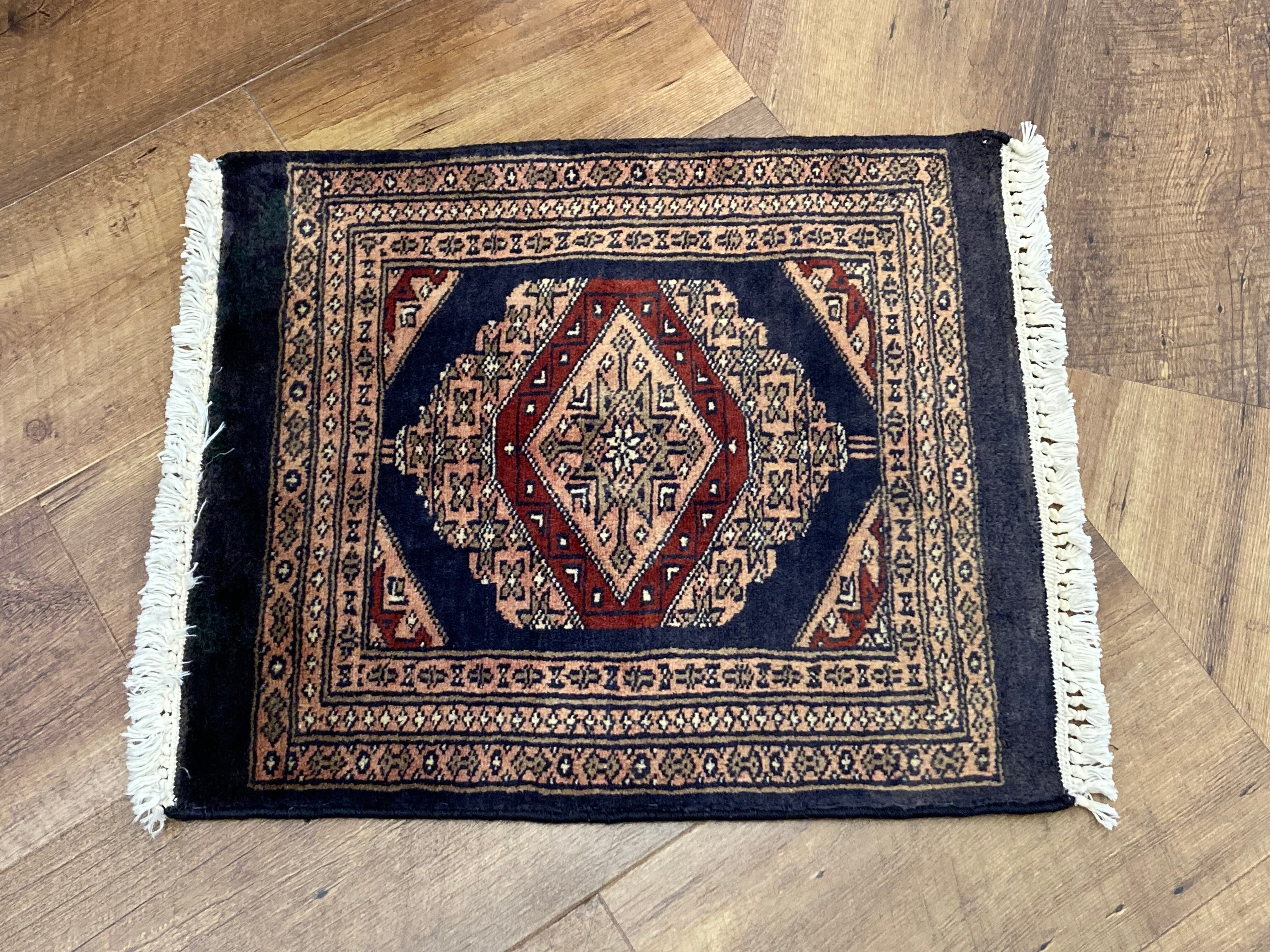 ネイビーと赤・茶系の落ち着いた色味で、ギュルが特徴的なスモールラグです。