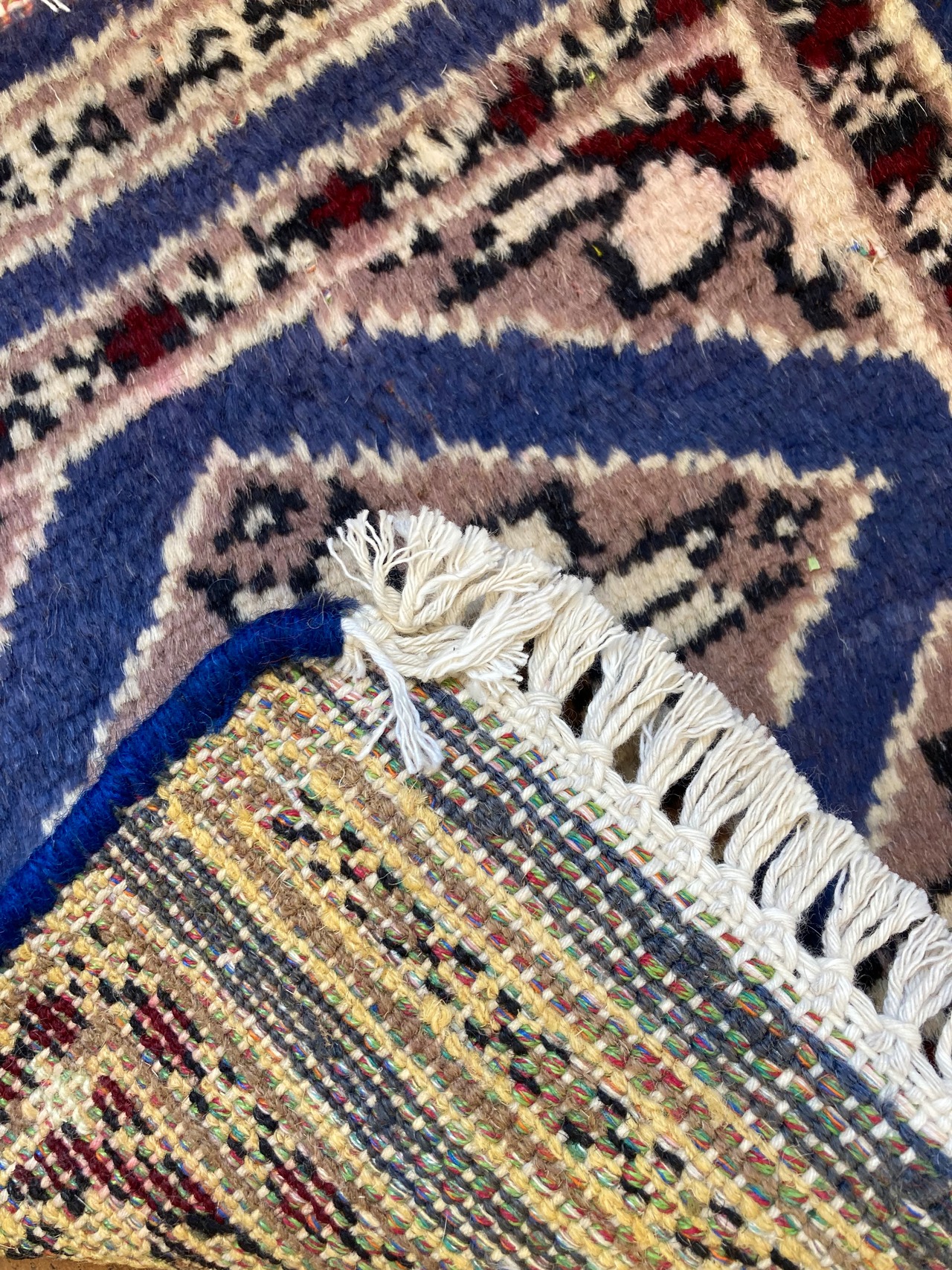 ネイビーブルー系の色味に雪の結晶の様なギュルが織り込まれた、寒い時期に使いたくなるミニラグです*