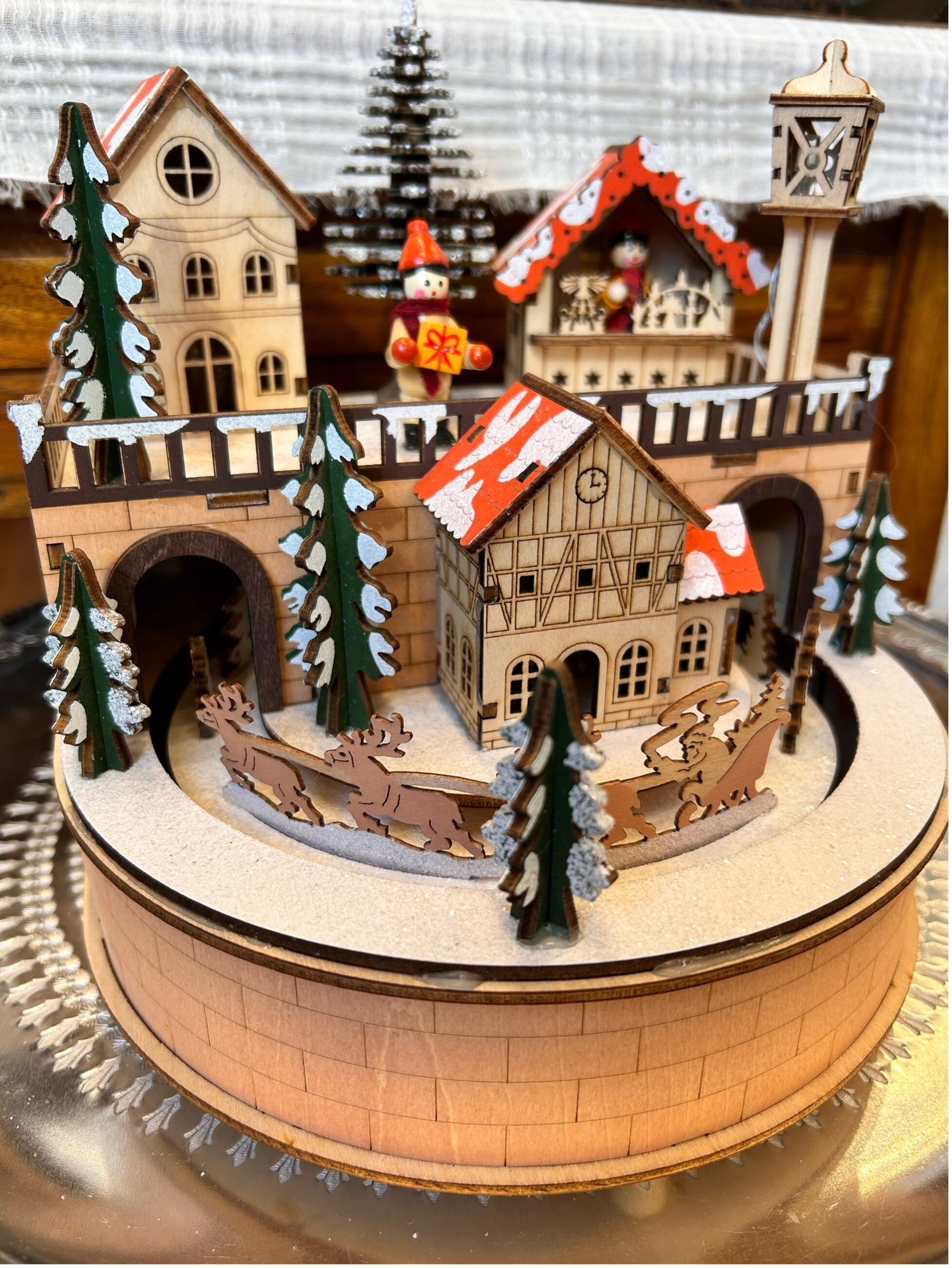木製のオルゴールとなっており、街灯・建物の中にあるLEDランプが点灯します。